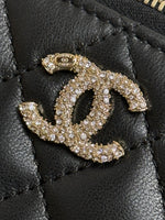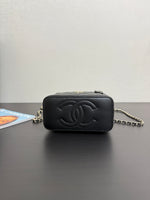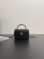 Confectionné en cuir matelassé noir, ce modèle reprend le motif iconique de Chanel, sublimé par le célèbre logo CC en métal doré sur la face avant. Sa structure rigide et épurée évoque l’univers des vanity cases de luxe, tout en restant résolument chic et contemporain.